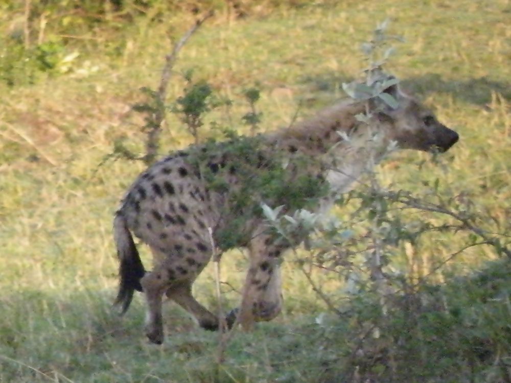 A nuestra entrada en el parque, una sorprendida hiena se cruza frente a nosotros para correr a refugiarse entre unos arbustos cercanos.